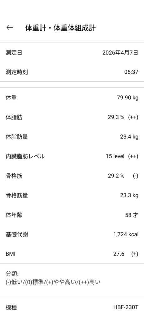 朝 79.9kg 昼の変化量 700g以下