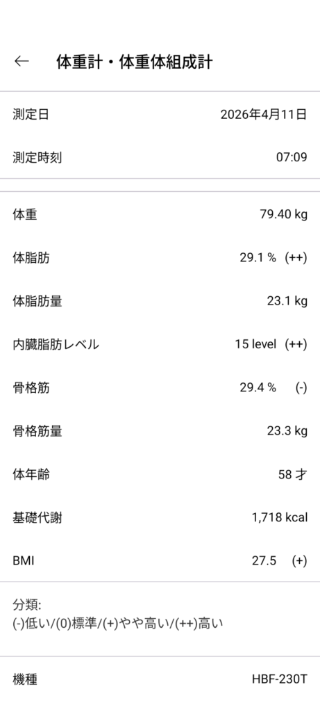 朝 79.4kg 昼の変化量 700g以下